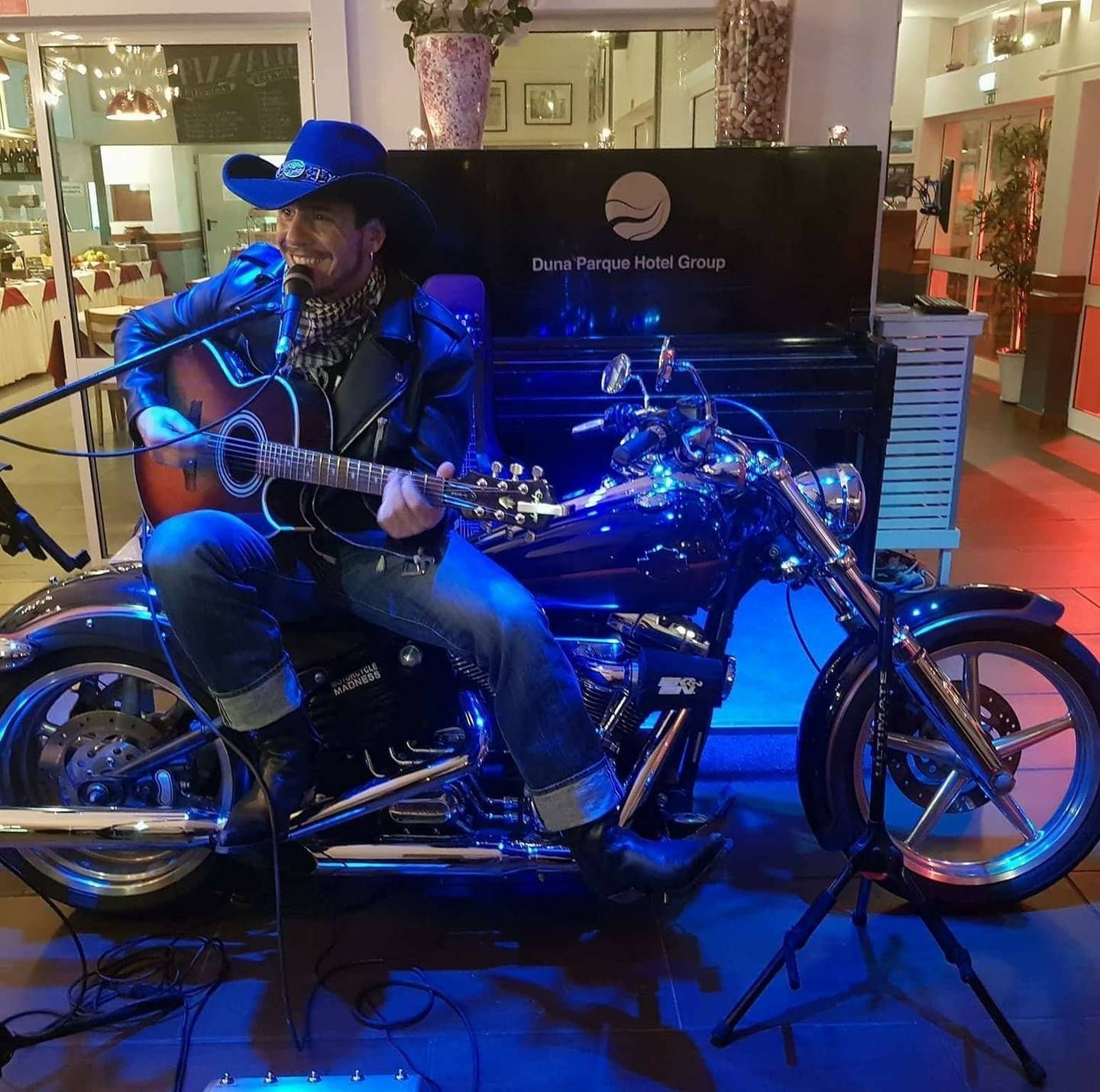 Sentado no couro gasto da sua Harley Davidson, guitarra ao colo e chapéu de cowboy bem assente sobre o cabelo despenteado, Nuno Coimbra, também conhecido como “Cowboy Strings”, é uma figura que parece saída de um cruzamento entre um palco de Nashville e um filme de estrada americano. Músico completo, carismático e inconfundível, Nuno tem conquistado o público não só pela sua voz rouca e cheia de alma, mas também pela imagem icónica que leva consigo para todo o lado.